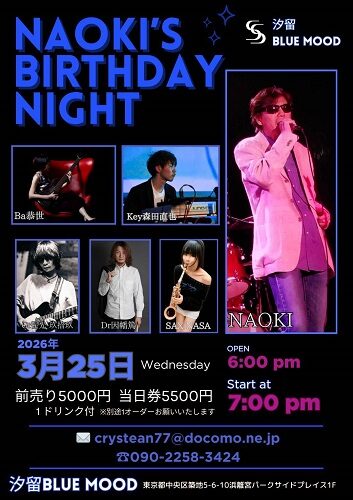 NAOKI‘S BIRTHDAY NIGHT 2026.03.25(Wed) OPEN / START18:00 / 19:00 前売り / 当日 ¥5000 / ¥5500 1ドリンク付 別途1オーダー要