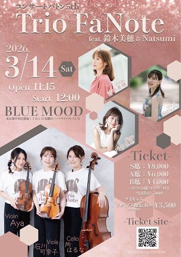 コンサートバトン5th Trio FaNote feat.鈴木美穂&Natsumi 2026.03.14(Sat) OPEN / START11:15 / 12:00 おひとり様2オーダー以上 Ticket S席:¥8,000 A席:¥6,000 B席:¥4,000 当日券は+¥500